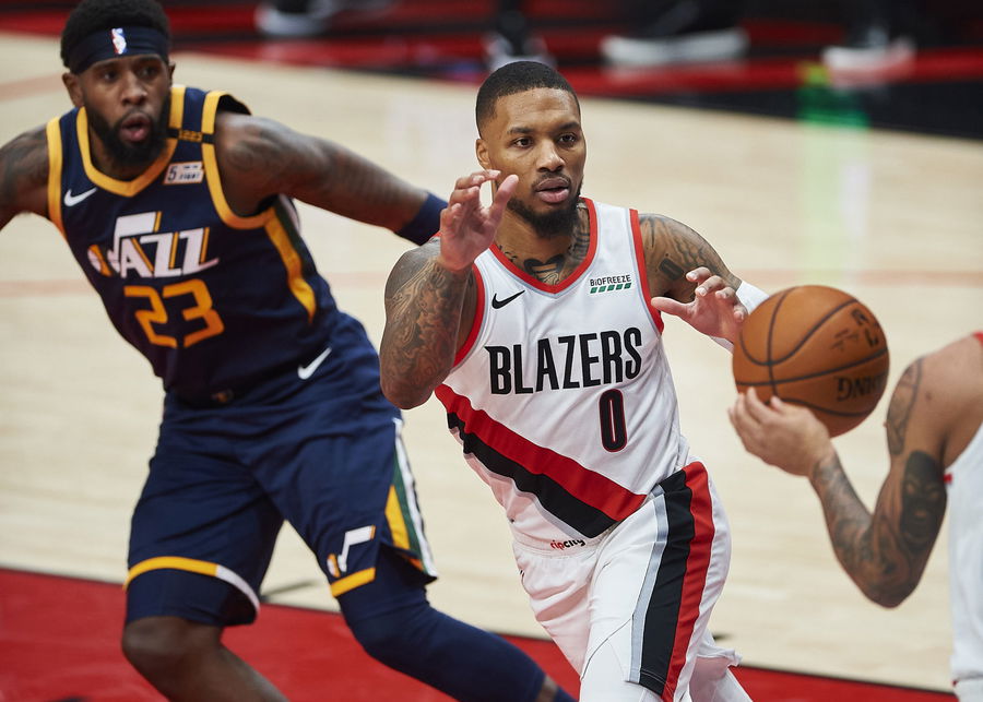 Dec 23, 2020; Portland, Oregon, USA; Portland Trail Blazers guard Damian Lillard (0) catches a pass against Utah Jazz forward Royce O’Neale (23) during the second half at Moda Center. The Utah Jazz won the game 120-100. Mandatory Credit: Troy Wayrynen-USA TODAY Sports