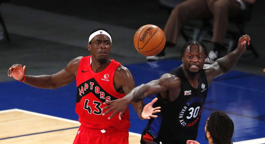 Apr 24, 2021; New York, New York, USA; Toronto Raptors forward Pascal Siakam (43) and New York Knicks forward Julius Randle (30) battle for a loose ball during the second half of an NBA basketball game Saturday, April 24,2021, in New York. The New York Knicks won 120-103.