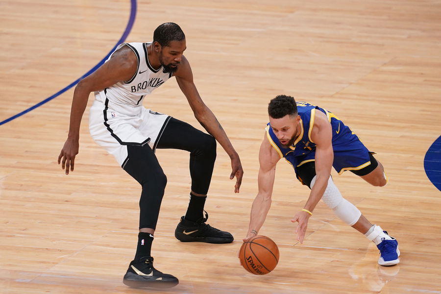 Feb 13, 2021; San Francisco, California, USA; Golden State Warriors guard Stephen Curry (30) grabs a loose ball against Brooklyn Nets forward Kevin Durant (7) in the second quarter at the Chase Center. Mandatory Credit: Cary Edmondson-USA TODAY Sports