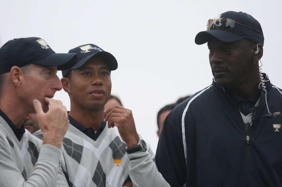 SAN FRANCISCO – OCTOBER 10: Tiger Woods of the USA Team stands with the Team Assistant Michael Jordan during the Day Three Afternoon Fourball Matches of The Presidents Cup at Harding Park Golf Course on October 10, 2009 in San Francisco, California. (Photo by Warren Little/Getty Images)