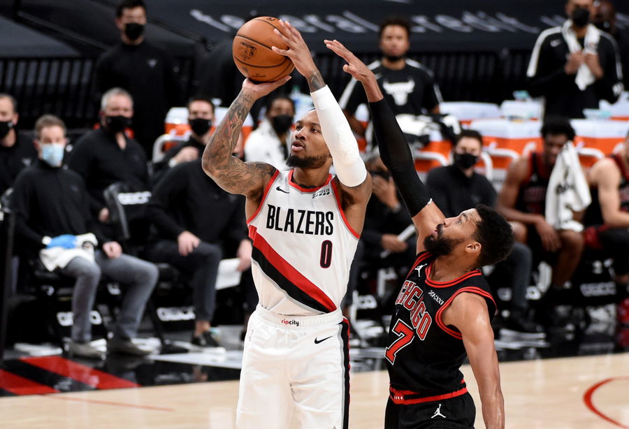 Jan 5, 2021; Portland, Oregon, USA; Portland Trail Blazers guard Damian Lillard (0) shoots against Chicago Bulls guard Garrett Temple (17) during the second half at Moda Center. Mandatory Credit: Steve Dykes-USA TODAY Sports