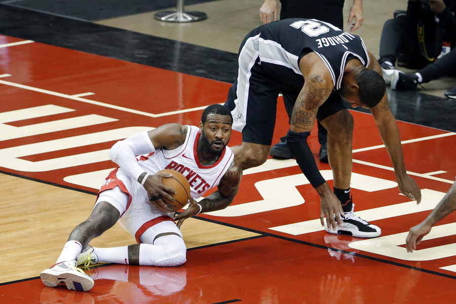 Dec 15, 2020; Houston, TX, USA; Houston Rockets guard John Wall (1) comes up with a loose ball in front of San Antonio Spurs forward LaMarcus Aldridge (12) during the first half. Mandatory Credit: Mike Wyke/Pool Photo via USA TODAY Sports