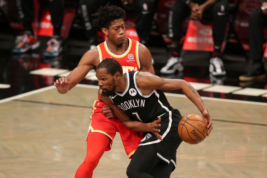 Jan 1, 2021; Brooklyn, New York, USA; Brooklyn Nets small forward Kevin Durant (7) drives to the basket against Atlanta Hawks small forward De’Andre Hunter (back) during the first quarter at Barclays Center. Mandatory Credit: Brad Penner-USA TODAY Sports