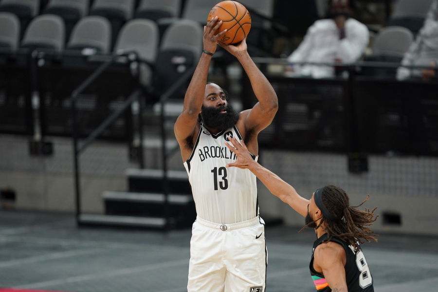 Mar 1, 2021; San Antonio, Texas, USA; Brooklyn Nets guard James Harden (13) shoots in the second half against the San Antonio Spurs at the AT&T Center. Mandatory Credit: Daniel Dunn-USA TODAY Sports