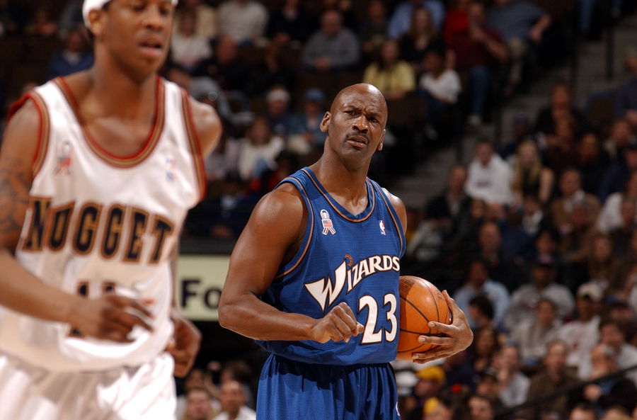 Wizards star Michael Jordan watches Denver’s Kenny Satterfield during the first period of last nights game between the Denver Nuggets and the Washington Wizards. (Craig F. Walker/The Denver Post) (Photo By Craig F. Walker/The Denver Post via Getty Images)