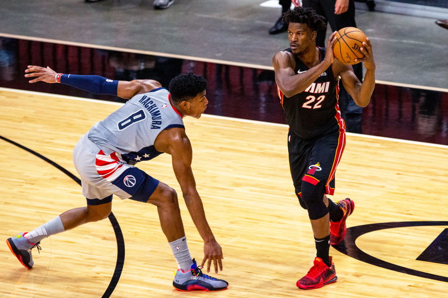 Feb 5, 2021; Miami, Florida, USA; Miami Heat forward Jimmy Butler (22) protects the ball from Washington Wizards forward Rui Hachimura (8) during the second quarter of the game at American Airlines Arena. Mandatory Credit: Sam Navarro-USA TODAY Sports