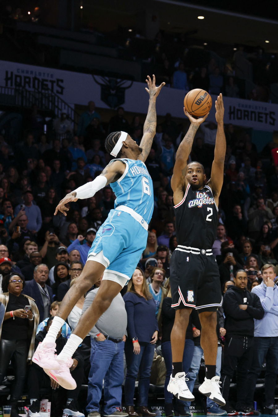 Dec 5, 2022; Charlotte, North Carolina, USA; Los Angeles Clippers forward Kawhi Leonard (2) shoots the game-winning shot over Charlotte Hornets forward Jalen McDaniels (6) during the second half at Spectrum Center. The Los Angeles Clippers won 119-117. Mandatory Credit: Nell Redmond-USA TODAY Sports