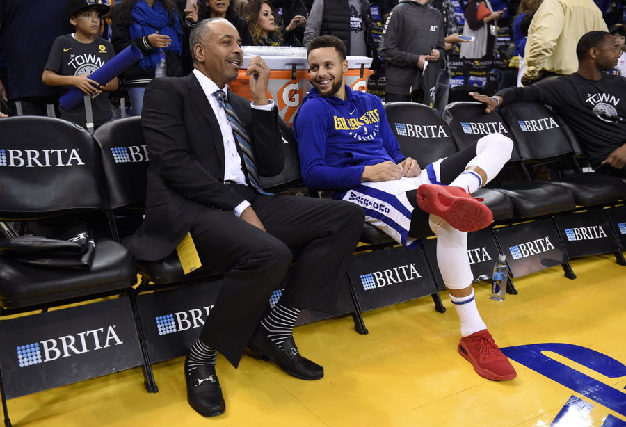 Dell Curry chats with his son Golden State Warriors’ Stephen Curry (30) while sitting on the sideline before the start of their NBA game against the Charlotte Hornets at the Oracle Arena in Oakland, Calif. on Friday, Dec. 29, 2017. (Jose Carlos Fajardo/Bay Area News Group) (Photo by MediaNews Group/Bay Area News via Getty Images)