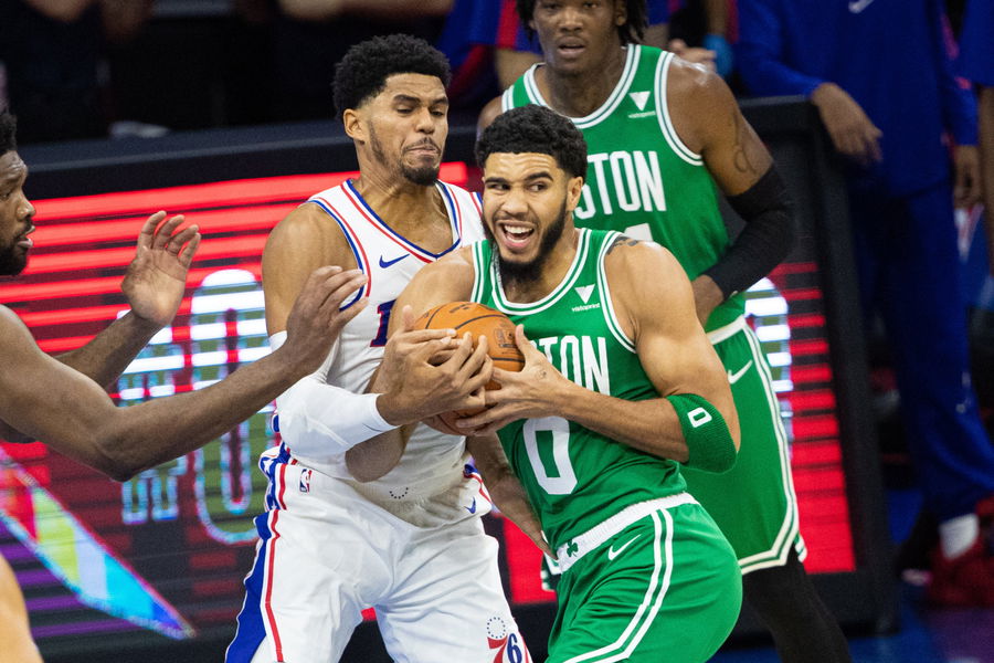 Dec 15, 2020; Philadelphia, Pennsylvania, USA; Boston Celtics forward Jayson Tatum (0) drives against Philadelphia 76ers forward Tobias Harris (12) during the first quarter at Wells Fargo Center. Mandatory Credit: Bill Streicher-USA TODAY Sports