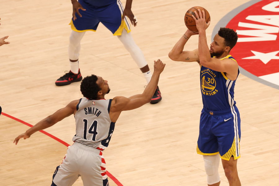 Apr 21, 2021; Washington, District of Columbia, USA; Golden State Warriors guard Stephen Curry (30) shoots the ball over Washington Wizards guard Ish Smith (14) in the third quarter at Capital One Arena. Mandatory Credit: Geoff Burke-USA TODAY Sports