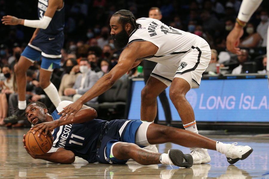 Oct 14, 2021; Brooklyn, New York, USA; Minnesota Timberwolves center Naz Reid (11) dives for a loose ball against Brooklyn Nets guard James Harden (13) during the second quarter at Barclays Center. Mandatory Credit: Brad Penner-USA TODAY Sports