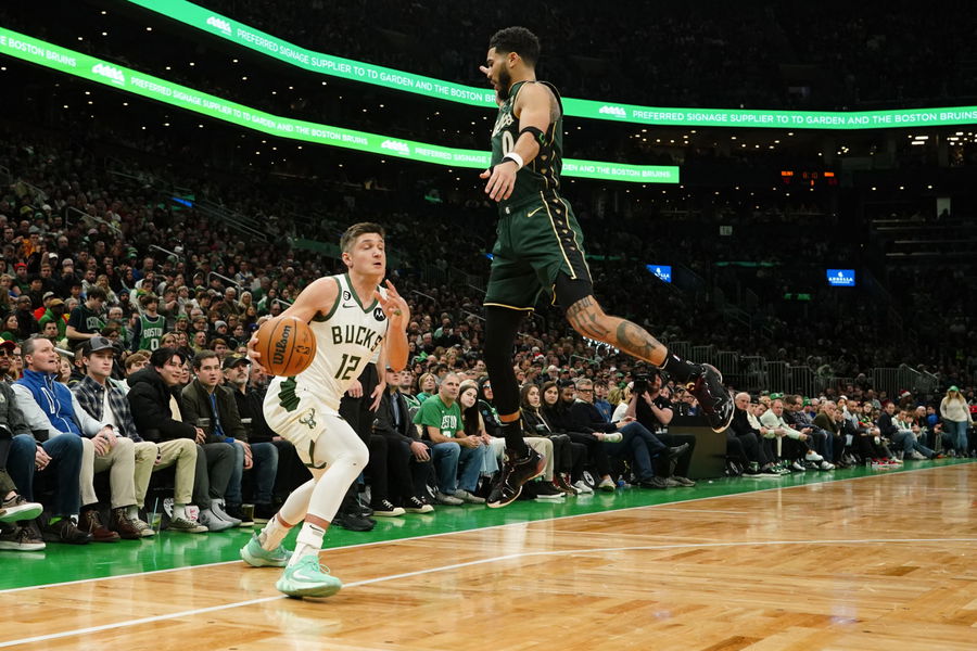 Dec 25, 2022; Boston, Massachusetts, USA; Milwaukee Bucks shooting guard Grayson Allen (12) dribbles the ball against Boston Celtics small forward Jayson Tatum (0) during the second half at TD Garden. Mandatory Credit: Gregory Fisher-USA TODAY Sports