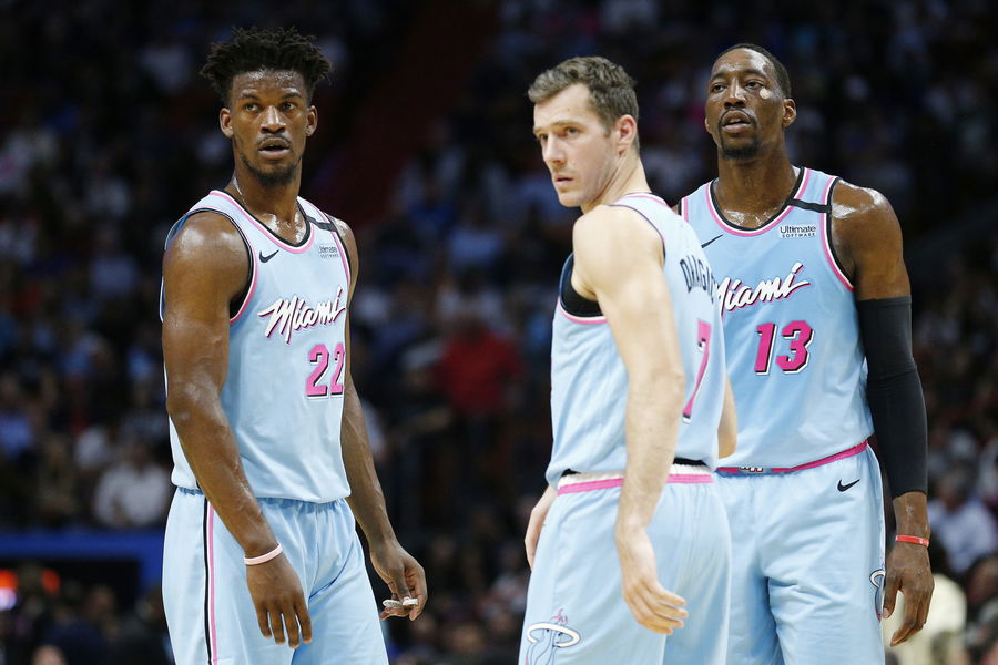 MIAMI, FLORIDA – MARCH 02: Jimmy Butler #22, Goran Dragic #7 and Bam Adebayo #13 of the Miami Heat look on against the Milwaukee Bucks during the second half at American Airlines Arena on March 02, 2020 in Miami, Florida. NOTE TO USER: User expressly acknowledges and agrees that, by downloading and/or using this photograph, user is consenting to the terms and conditions of the Getty Images License Agreement. (Photo by Michael Reaves/Getty Images)