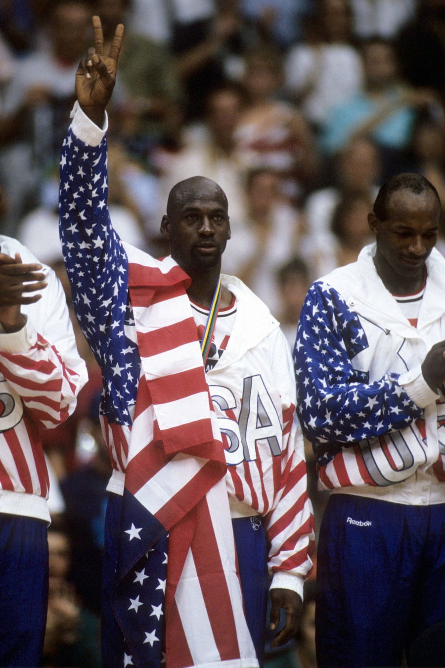 Michael Jordan li. und Clyde Drexler beide USA – Olympiasieger bei den Spielen 1992 in Barcelona