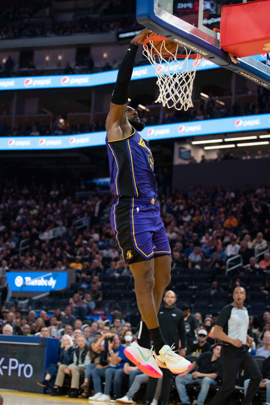 October 18, 2022; San Francisco, California, USA; Los Angeles Lakers forward LeBron James (6) dunks the basketball against the Golden State Warriors during the third quarter at Chase Center. Mandatory Credit: Kyle Terada-USA TODAY Sports