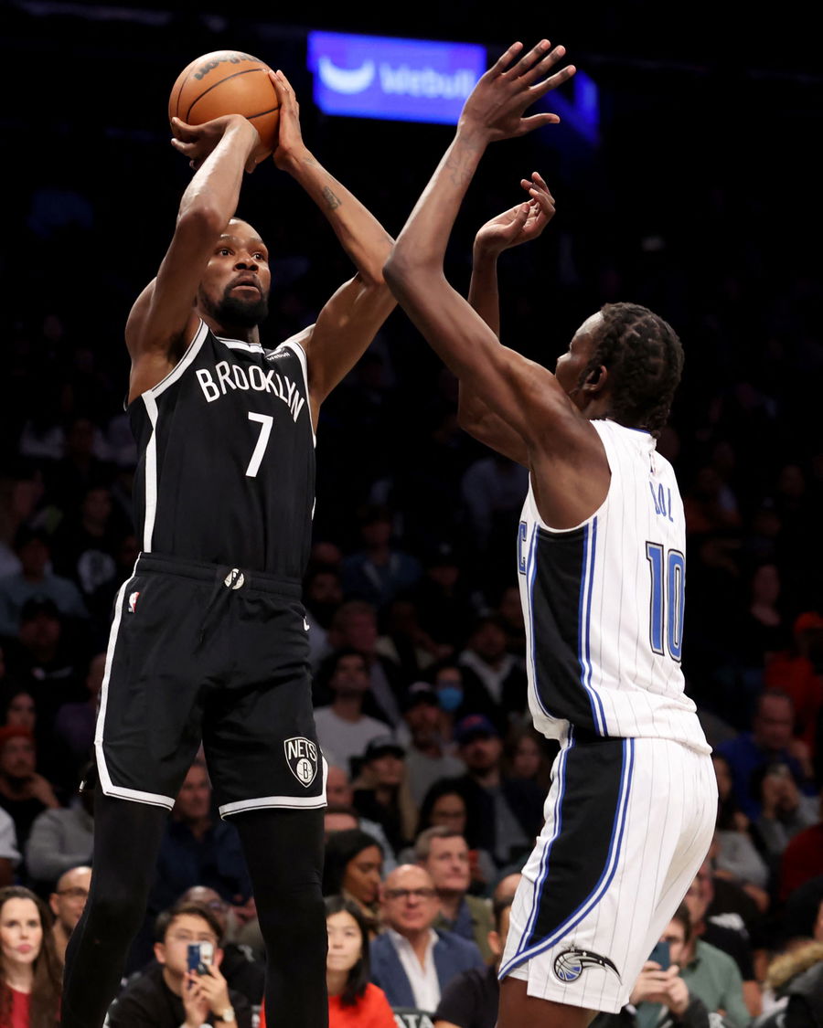 Nov 28, 2022; Brooklyn, New York, USA; Brooklyn Nets forward Kevin Durant (7) shoots over Orlando Magic center Bol Bol (10) during the fourth quarter at Barclays Center. Mandatory Credit: Brad Penner-USA TODAY Sports