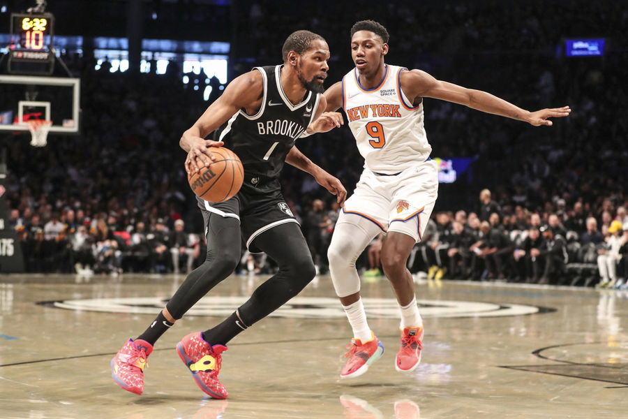 Mar 13, 2022; Brooklyn, New York, USA; Brooklyn Nets forward Kevin Durant (7) drives against New York Knicks guard RJ Barrett (9) in the third quarter at Barclays Center. Mandatory Credit: Wendell Cruz-USA TODAY Sports
