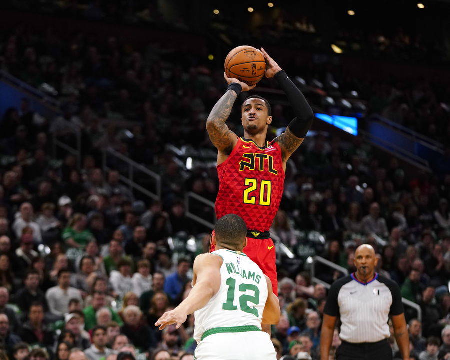 BOSTON, MASSACHUSETTS – FEBRUARY 07: John Collins #20 of the Atlanta Hawks shoots over Grant Williams #12 of the Boston Celtics during the first quarter of the game at TD Garden on February 07, 2020 in Boston, Massachusetts.(Photo by Omar Rawlings/Getty Images)