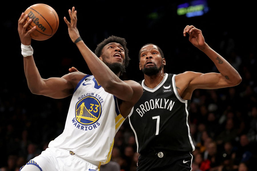Dec 21, 2022; Brooklyn, New York, USA; Golden State Warriors center James Wiseman (33) drives to the basket against Brooklyn Nets forward Kevin Durant (7) during the first quarter at Barclays Center. Mandatory Credit: Brad Penner-USA TODAY Sports