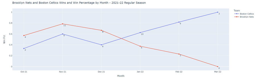 Brooklyn Nets and Boston Celtics Wins and Win Percentage by Month – 2021-22 Regular Season (Stats valid as of 7th March 2022)