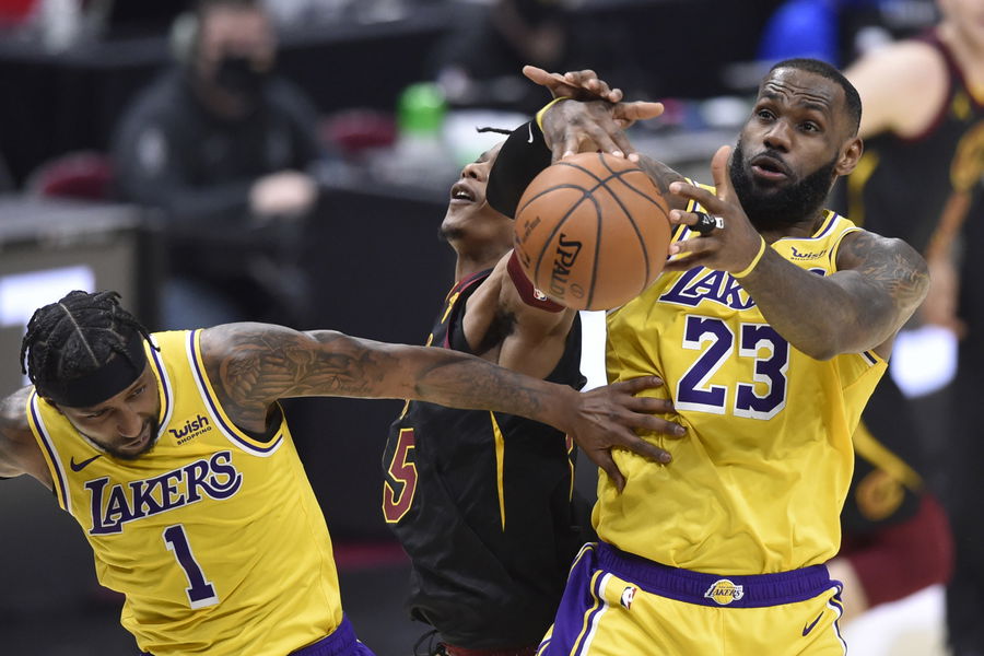 Jan 25, 2021; Cleveland, Ohio, USA; Cleveland Cavaliers guard Isaac Okoro (35) looks to rebound between Los Angeles Lakers guard Kentavious Caldwell-Pope (1) and forward LeBron James (23) in the second quarter at Rocket Mortgage FieldHouse. Mandatory Credit: David Richard-USA TODAY Sports