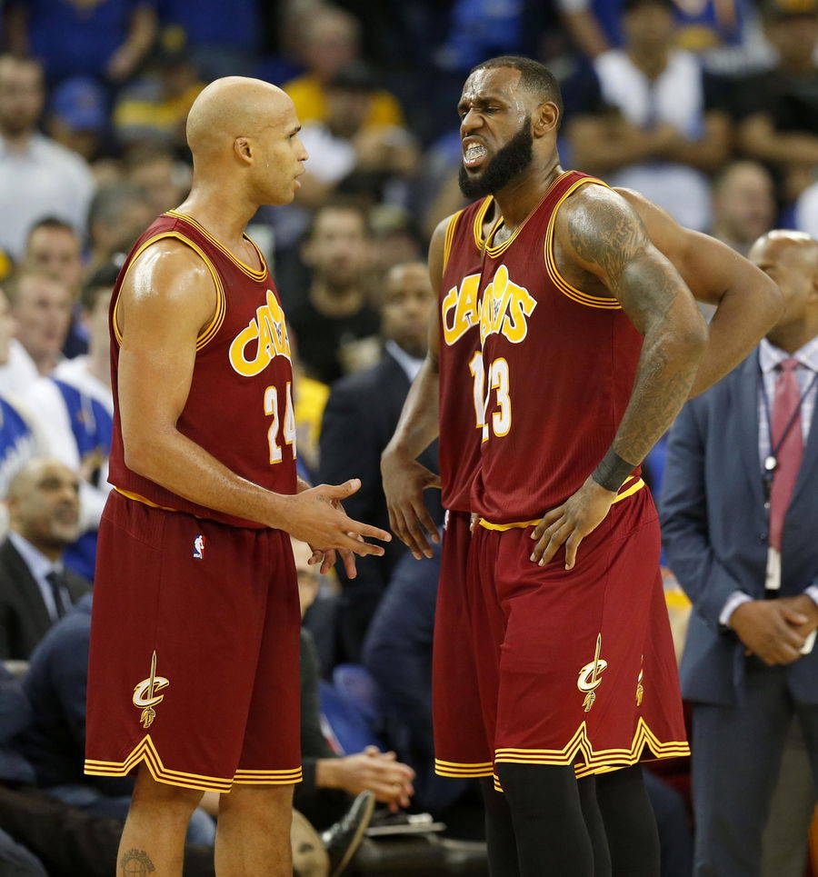 Cleveland Cavaliers’ LeBron James (23) and Richard Jefferson (24) stand on the courts after James was fouled by Golden State Warriors’ Draymond Green (23) in the second quarter of their game at Oracle Arena in Oakland, Calif., on Monday, Jan. 16, 2017. (Jane Tyska/Bay Area News Group) (Photo by MediaNews Group/Bay Area News via Getty Images)