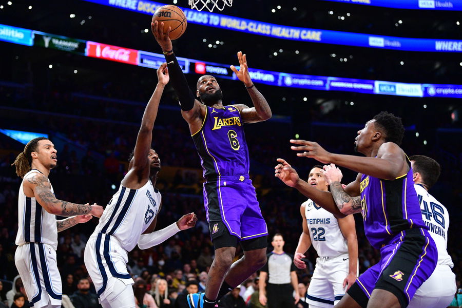 January 20, 2023; Los Angeles, California, USA; Los Angeles Lakers forward LeBron James (6) moves to the basket against Memphis Grizzlies forward Jaren Jackson Jr. (13) during the first half at Crypto.com Arena. Mandatory Credit: Gary A. Vasquez-USA TODAY Sports