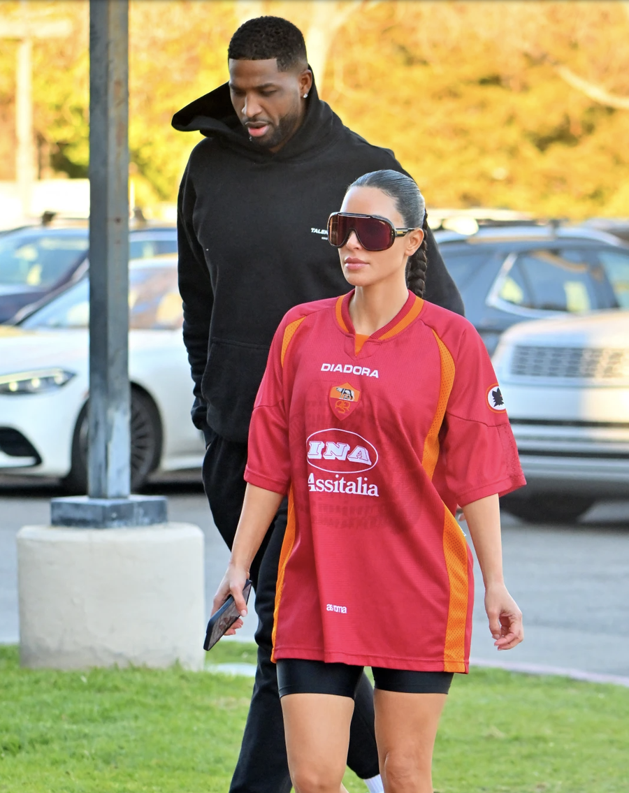 Earlier in the day, Tristan and Kim were photographed together in a parking lot. The duo was on their way to watch Kim’s son, Saint, at his basketball game. Tristan was dressed in a black hoodie and pants that were paired with white shoes and socks. On the other hand, Kim flaunted an AS Roma jersey with black shoes and shorts. She also wore big red shades. The duo ignored the paparazzi as they made their way to the game.