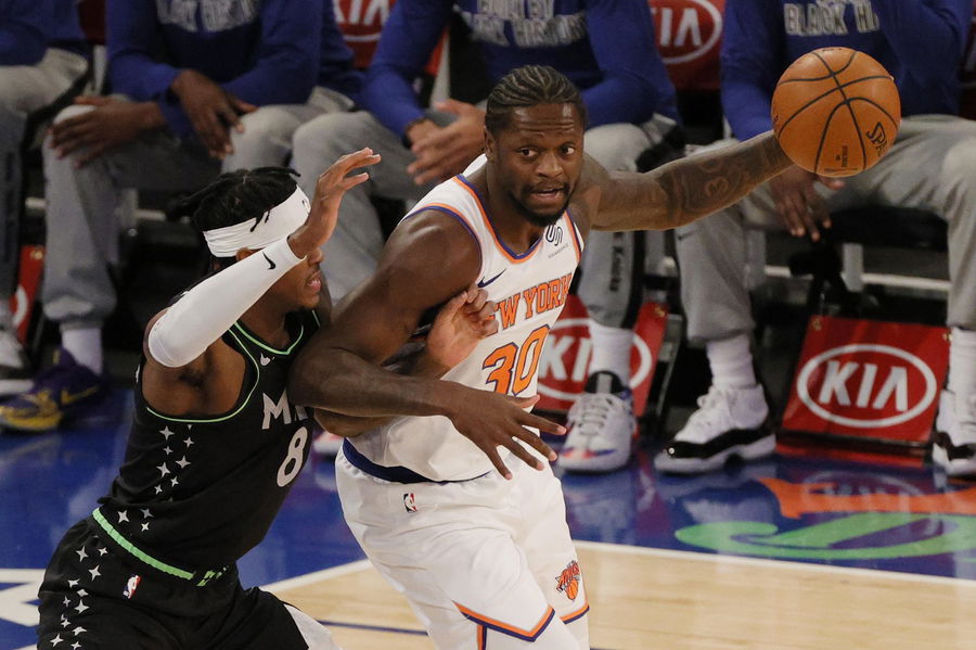 Feb 21, 2021; New York, New York, USA; Julius Randle #30 of the New York Knicks dribbles against Jarred Vanderbilt #8 of the Minnesota Timberwolves during the first half at Madison Square Garden on February 21, 2021 in New York City. Mandatory Credit: Sarah Stier/Pool Photo-USA TODAY Sports