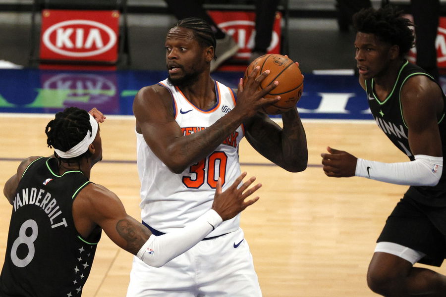 Feb 21, 2021; New York, New York, USA; Julius Randle #30 of the New York Knicks looks to pass as Jarred Vanderbilt #8 and Anthony Edwards #1 of the Minnesota Timberwolves defend during the first half at Madison Square Garden on February 21, 2021 in New York City. Mandatory Credit: Sarah Stier/Pool Photo-USA TODAY Sports