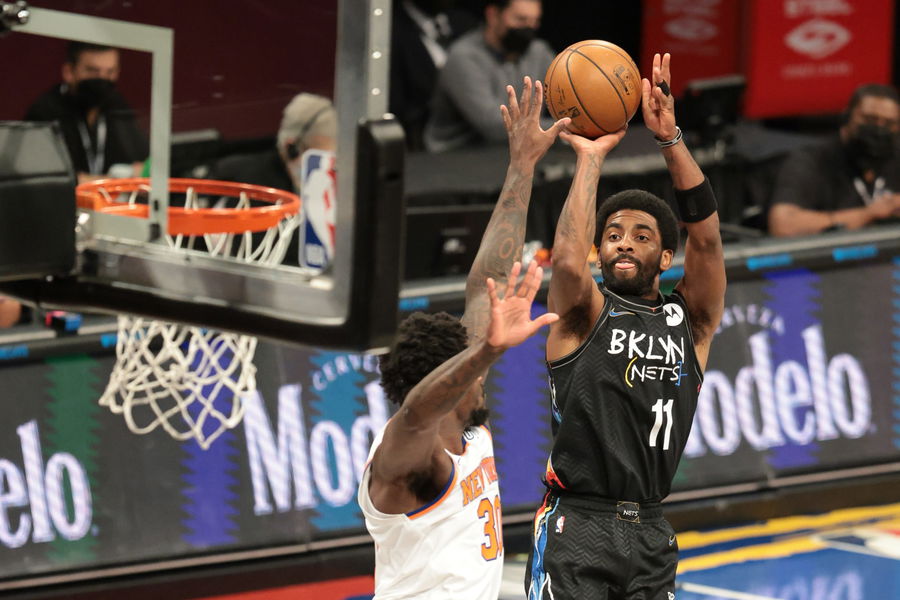 Apr 5, 2021; Brooklyn, New York, USA; Brooklyn Nets guard Kyrie Irving (11) shoots the ball over New York Knicks forward Julius Randle (30) during the first quarter at Barclays Center. Mandatory Credit: Vincent Carchietta-USA TODAY Sports