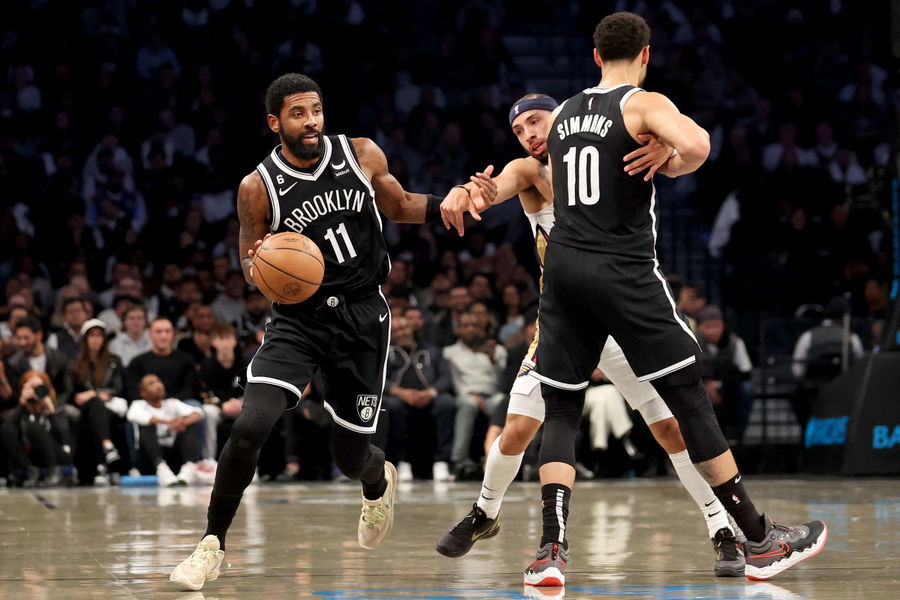Oct 19, 2022; Brooklyn, New York, USA; Brooklyn Nets guard Ben Simmons (10) sets a pick for guard Kyrie Irving (11) against New Orleans Pelicans guard Jose Alvarado (15) during the first quarter at Barclays Center. Mandatory Credit: Brad Penner-USA TODAY Sports