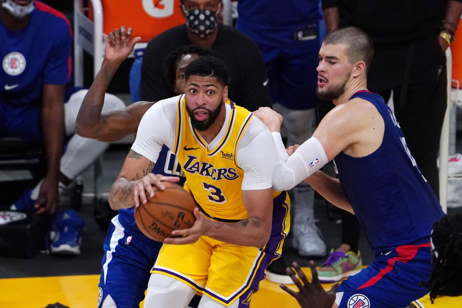 Lakers’ Anthony Davis controls the ball against Clippers’ Patrick Beverley and Ivica Zubac in the fourth quarter at Staples Center. The Clippers defeated the Lakers. Mandatory Credit: Kirby Lee-USA TODAY Sports