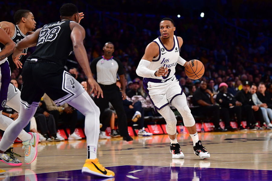 Nov 20, 2022; Los Angeles, California, USA; Los Angeles Lakers guard Russell Westbrook (0) moves the ball against the San Antonio Spurs during the second half at Crypto.com Arena. Mandatory Credit: Gary A. Vasquez-USA TODAY Sports