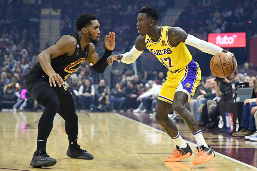 Dec 6, 2022; Cleveland, Ohio, USA; Cleveland Cavaliers guard Donovan Mitchell (45) defends Los Angeles Lakers guard Dennis Schroder (17) in the first quarter at Rocket Mortgage FieldHouse. Mandatory Credit: David Richard-USA TODAY Sports