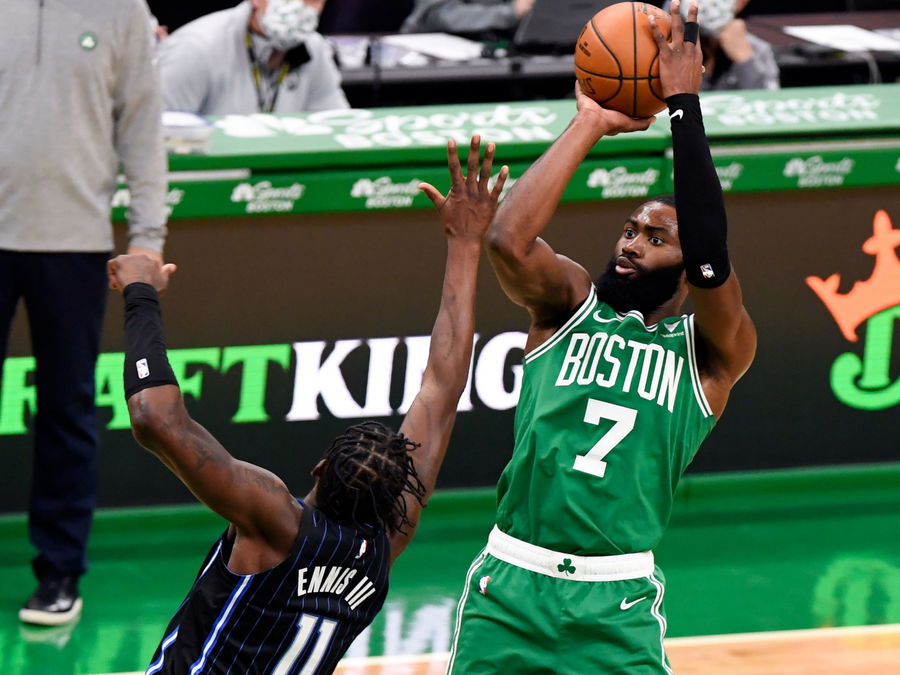 Jan 15, 2021; Boston, Massachusetts, USA; Boston Celtics guard Jaylen Brown (7) attempts a basket against Orlando Magic forward James Ennis III (11) during the third quarter at TD Garden. Mandatory Credit: Brian Fluharty-USA TODAY Sports