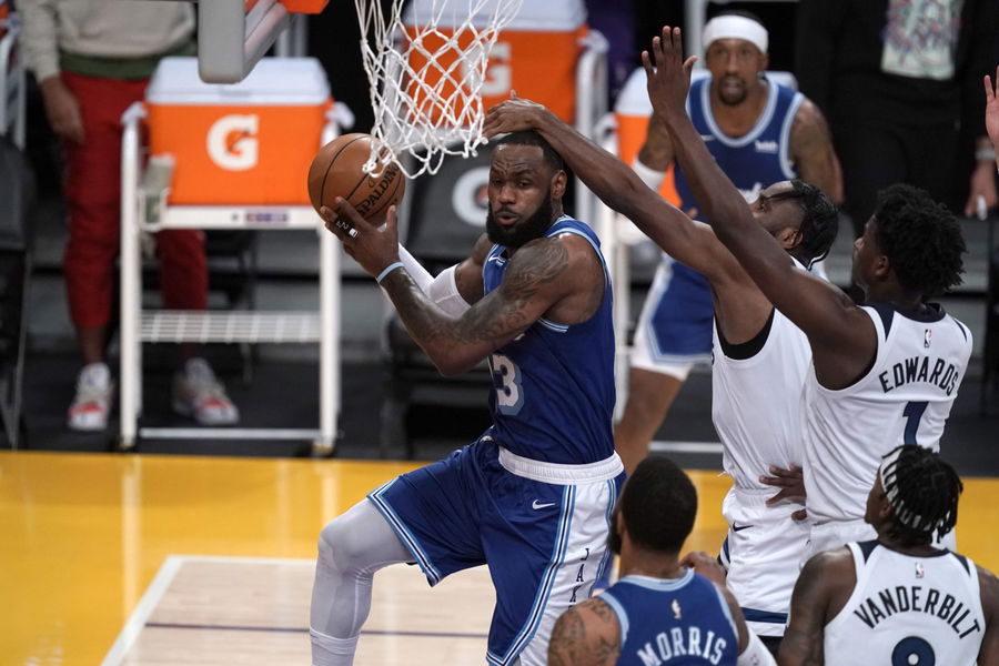 Mar 16, 2021; Los Angeles, California, USA; Los Angeles Lakers forward LeBron James (23) drives against Minnesota Timberwolves forward Anthony Edwards (1) and guard Jaylen Nowell (4) in the first half at Staples Center. Mandatory Credit: Kirby Lee-USA TODAY Sports