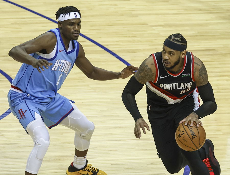 Jan 28, 2021; Houston, Texas, USA; Portland Trail Blazers forward Carmelo Anthony (00) dribbles the ball as Houston Rockets forward Danuel House Jr. (4) defends during the second quarter at Toyota Center. Mandatory Credit: Troy Taormina-USA TODAY Sports