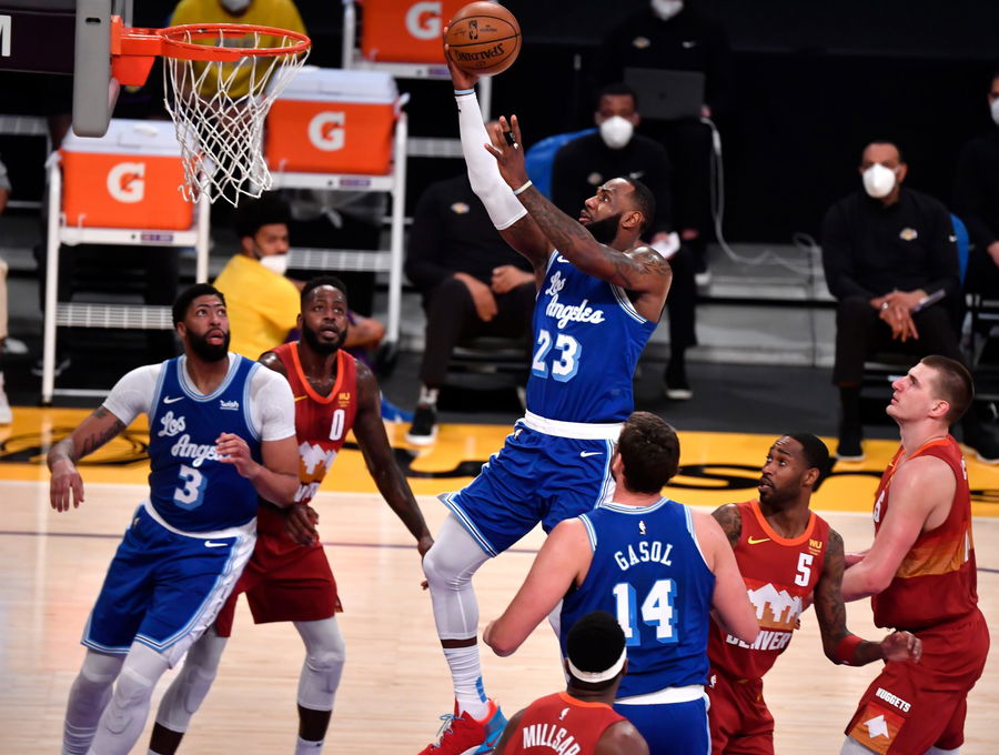 Feb 4, 2021; Los Angeles, California, USA; Los Angeles Lakers forward LeBron James (23) moves to the basket and scores during the first quarter against the Denver Nuggets at Staples Center. Mandatory Credit: Robert Hanashiro-USA TODAY Sports