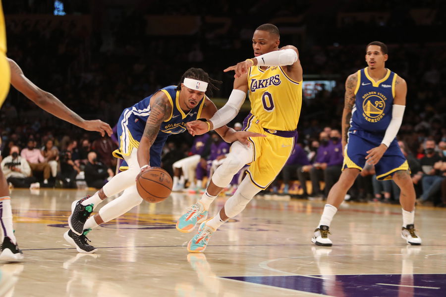 Oct 12, 2021; Los Angeles, California, USA; Golden State Warriors guard Damion Lee (1) drives against Los Angeles Lakers guard Russell Westbrook (0) during the second quarter at Staples Center. Mandatory Credit: Kiyoshi Mio-USA TODAY Sports