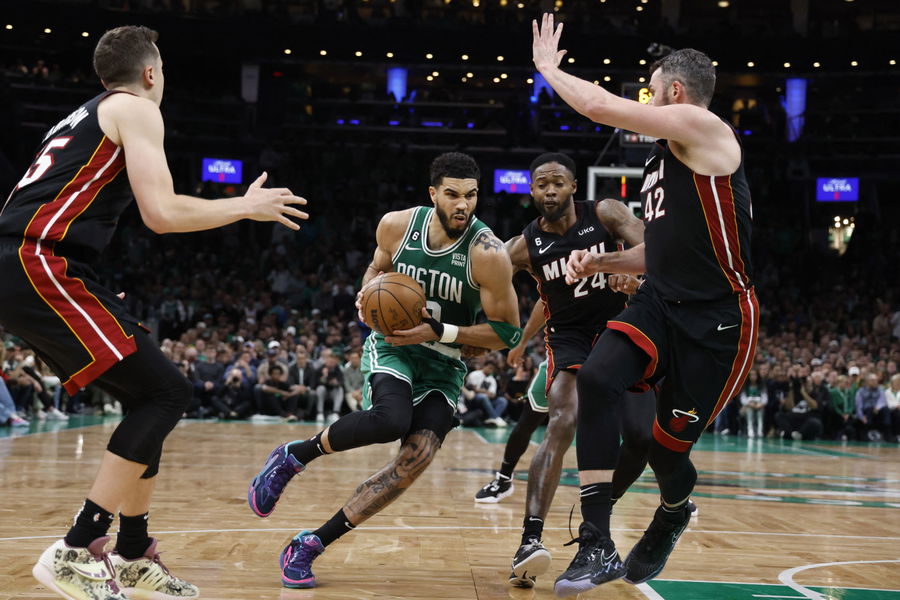 May 25, 2023; Boston, Massachusetts, USA; Boston Celtics forward Jayson Tatum (0) controls the ball against Miami Heat forward Haywood Highsmith (24) and forward Kevin Love (42) during the fourth quarter of game five of the Eastern Conference Finals for the 2023 NBA playoffs at TD Garden. Mandatory Credit: Winslow Townson-USA TODAY Sports