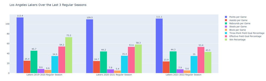 Los Angeles Lakers Over the Last 3 Regular Seasons (Stats of 2021-22 Season are valid as of 14th March 2022)