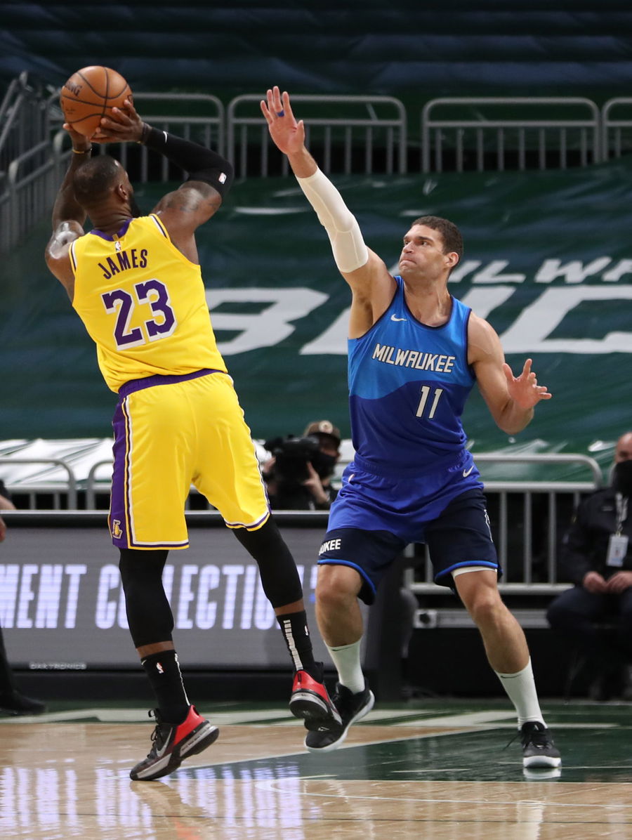 Jan 21, 2021; Milwaukee, WI, USA; Los Angeles Lakers forward LeBron James (23) shoots over Milwaukee Bucks center Brook Lopez (11) at the Bradley Center. Mandatory Credit: Nick Monroe/Handout Photo via USA TODAY Sports
