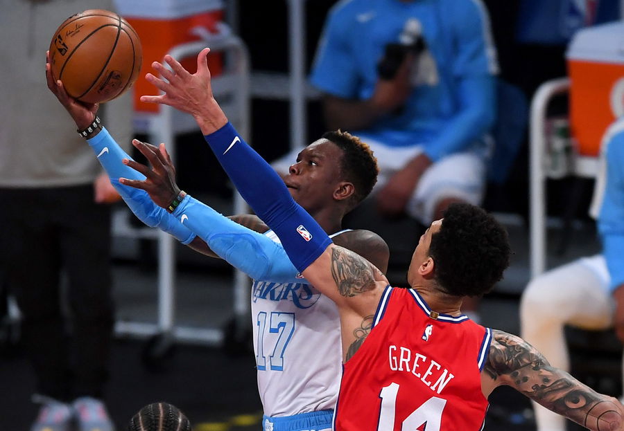 Mar 25, 2021; Los Angeles, California, USA; Los Angeles Lakers guard Dennis Schroder (17) gets past Philadelphia 76ers forward Danny Green (14) for a basket in the first half of the game at Staples Center. Mandatory Credit: Jayne Kamin-Oncea-USA TODAY Sports