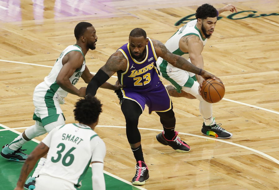 Jan 30, 2021; Boston, Massachusetts, USA; Boston Celtics forward Jayson Tatum (0) comes from behind Los Angeles Lakers forward LeBron James (23) to steal the ball during the third quarter at TD Garden. Mandatory Credit: Winslow Townson-USA TODAY Sports