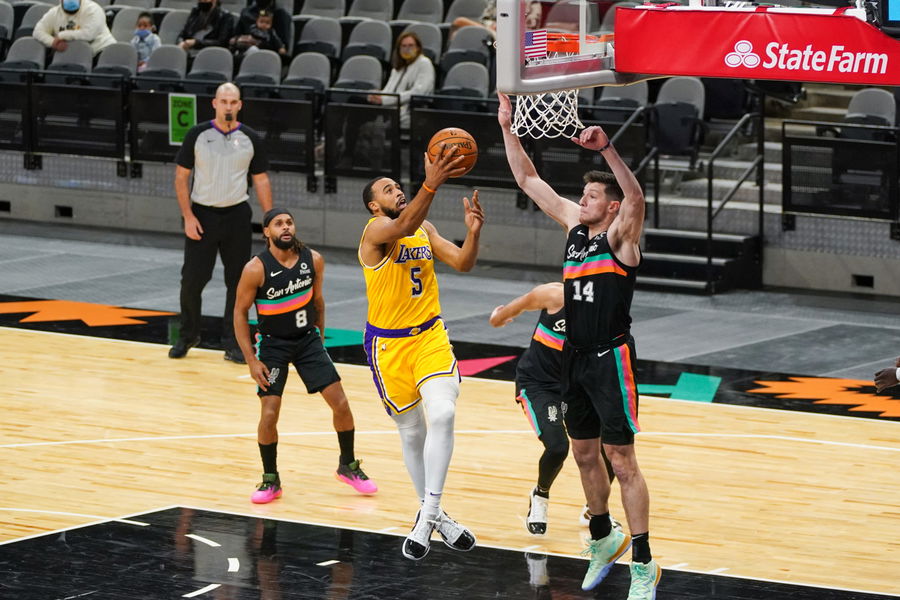 Jan 1, 2021; San Antonio, Texas, USA; Los Angeles Lakers guard Talen Horton-Tucker (5) shoots over San Antonio Spurs forward Drew Eubanks (14) in the second half at the AT&T Center. Mandatory Credit: Daniel Dunn-USA TODAY Sports