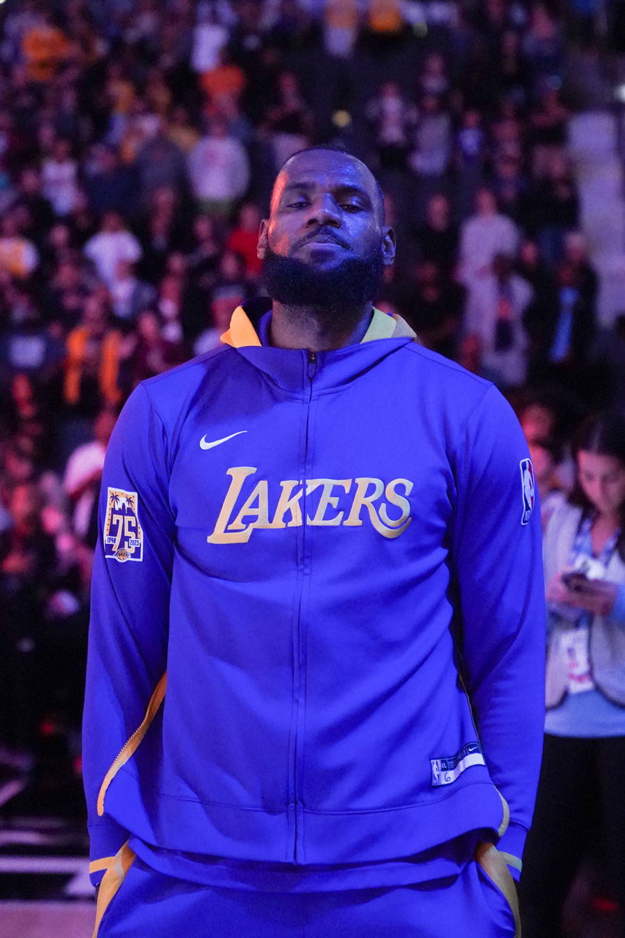 Nov 26, 2022; San Antonio, Texas, USA; Los Angeles Lakers forward LeBron James (6) during the national anthem before the game against the San Antonio Spurs at the AT&T Center. Mandatory Credit: Daniel Dunn-USA TODAY Sports