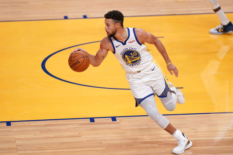 Jan 1, 2021; San Francisco, California, USA; Golden State Warriors guard Stephen Curry (30) brings the ball up the court against the Portland Trail Blazers in the first quarter at the Chase Center. Mandatory Credit: Cary Edmondson-USA TODAY Sports