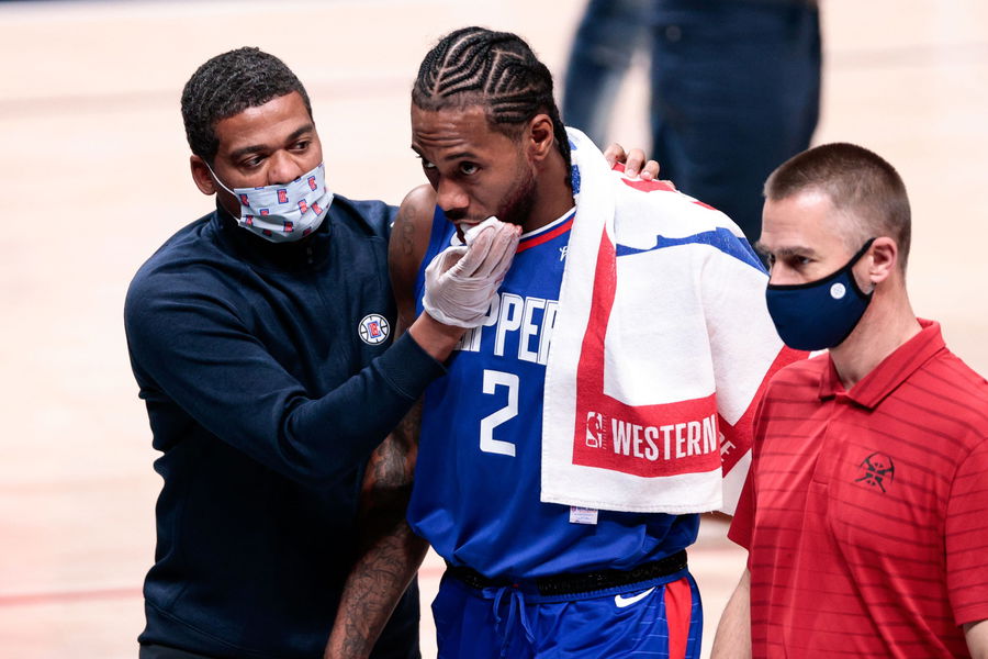 Dec 25, 2020; Denver, Colorado, USA; Los Angeles Clippers forward Kawhi Leonard (2) is tended to by head trainer Jasen Powell after an injury during a play in the fourth quarter against the Denver Nuggets at Ball Arena. Mandatory Credit: Isaiah J. Downing-USA TODAY Sports