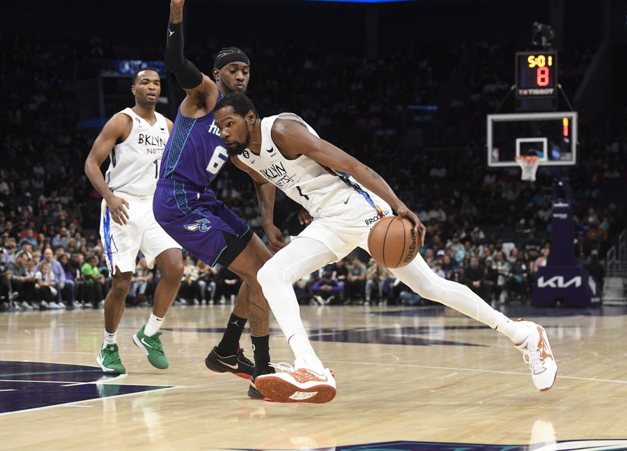 Dec 31, 2022; Charlotte, North Carolina, USA; Brooklyn Nets forward Kevin Durant (7) drives in against Charlotte Hornets forward Jalen Mcdaniels (6) during the first half at the Spectrum Center. Mandatory Credit: Sam Sharpe-USA TODAY Sports